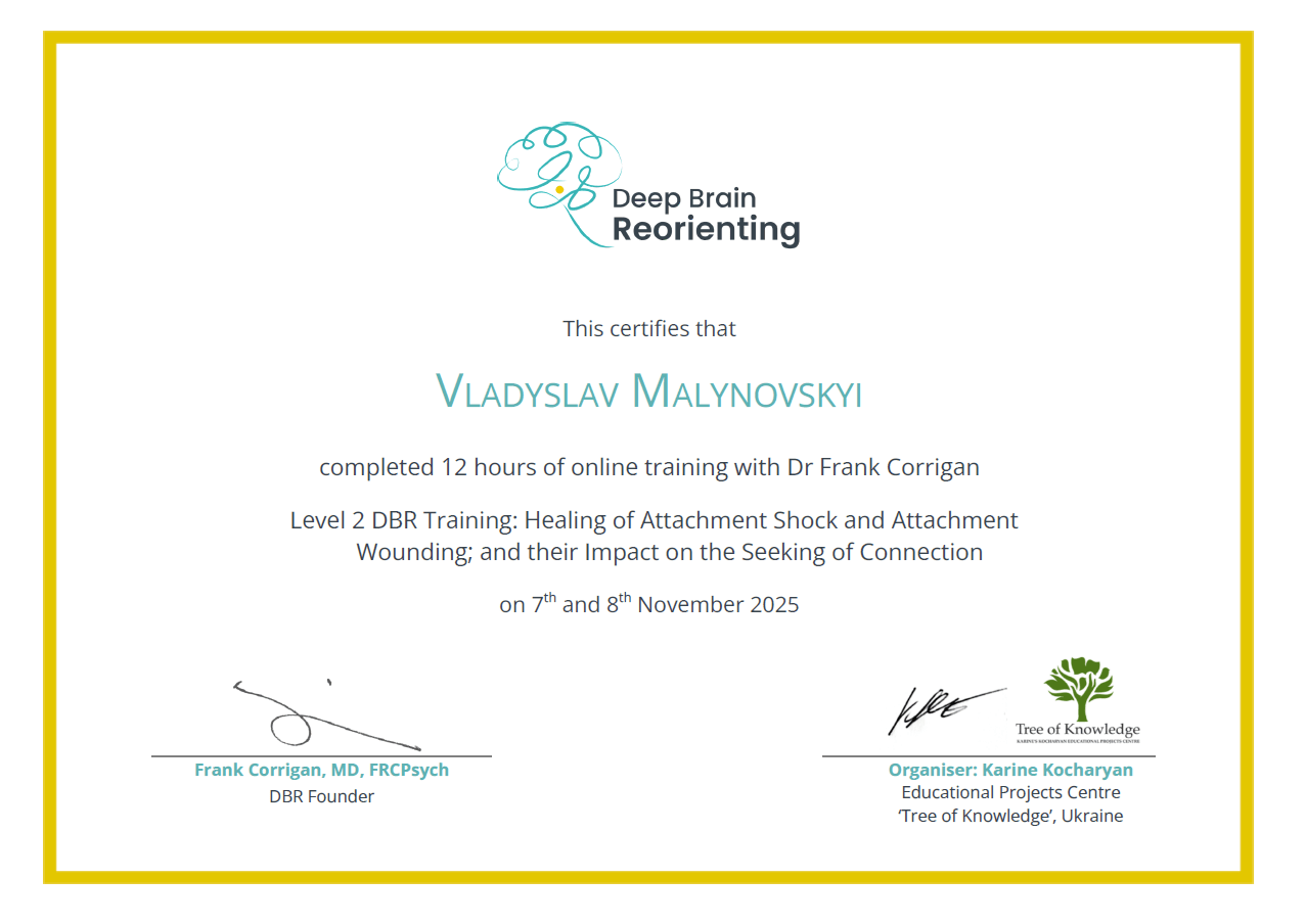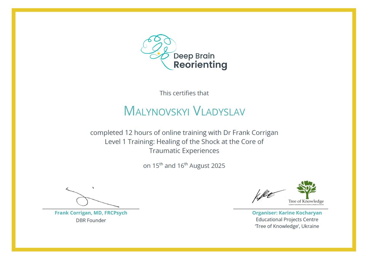 Мотив моєї діяльності – допомога молодим людям, які зіштовхнулися з проблемою невротичних розладів. Я передаю цінні знання, які отримав протягом шести років власної історії тяжкого неврозу. Я проводжу лікування тривожних розладів, лікування панічних атак, лікування дереалізації та деперсоналізації, і розумію як ніхто інший, через які випробування Ви йдете.